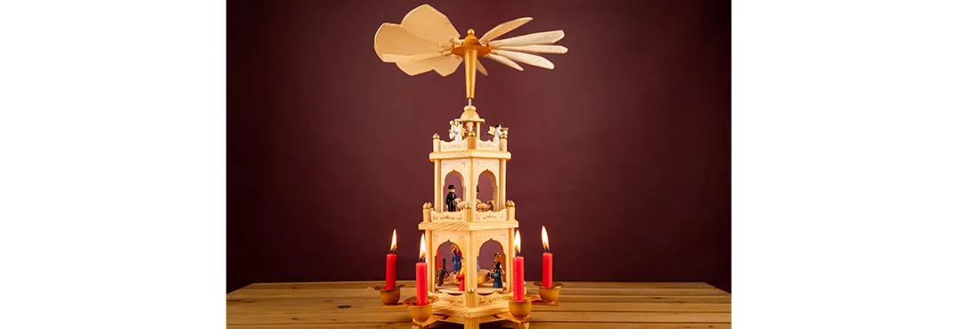 Une weihnachtspyramide (son nom allemand), est une structure en bois qui ressemble à un petit carrousel à un ou plusieurs étages, et qui tourne sur lui-même grâce à la chaleur de bougies. Cette pyramide est décorée de figurines, allant de petits personnages (bergers, paysans, musiciens...) à des animaux en passant par des anges... Elle peut aussi représenter une crèche ou une scène de vie folklorique. Quand elle s’anime, on dirait un manège. C’est lumineux et festif !
