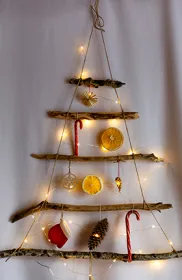 Des branches à accrocher au mur en dessinant une pyramide, puis à décorer ;