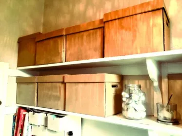 Sur les étagères du haut, on en profite pour ranger des affaires dont on n’a pas besoin au quotidien.