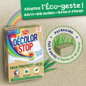 Découvrez Décolor Stop Max Protect* + Éco, notre meilleure référence pour protéger des accidents de décoloration avec un impact limité sur l'environnement. Nos lingettes sont faites à partir de fibres 100% d'origine naturelle et sont sans parfum.