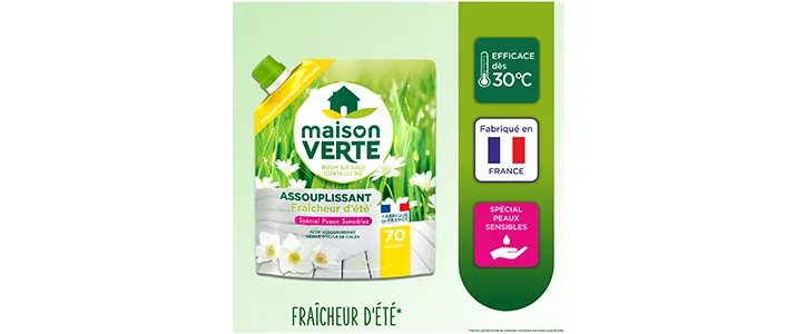 Spécialement conçu pour respecter les peaux sensibles, l’adoucissant Maison Verte Fraîcheur d’Été1 apporte douceur et souplesse à votre linge. Sa formule à base d’actifs d’origine végétale parfumée aux huiles essentielles1 enveloppe votre linge d’une délicate odeur de fraîcheur. Cet adoucissant, vous est proposé au format poche souple, majoritairement recyclable. Alors une fois vide, il trouve tout naturellement sa place dans le bac des déchets recyclables ! Optez pour notre adoucissant Maison Verte Fraîcheur d’Été¹ pour allier douceur et sensorialité dans votre quotidien.
