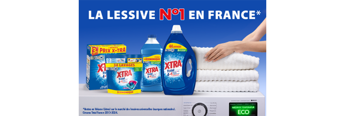 X•TRA c’est une seule lessive pour tout votre linge, à toute température. Sa formule vous assure un blanc lumineux et des couleurs éclatantes lavage après lavage, et toujours à prix X•TRA !