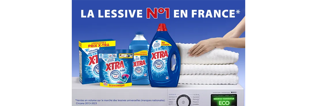 X•TRA Total fait peau neuve avec une performance renforcée. La gamme X•TRA Total contient désormais un boost d’enzymes et d’actifs contre les taches du quotidien, pour une performance anti-taches renforcée. La gamme X•TRA Total Déofraîcheur offre une fraîcheur intensifiée.